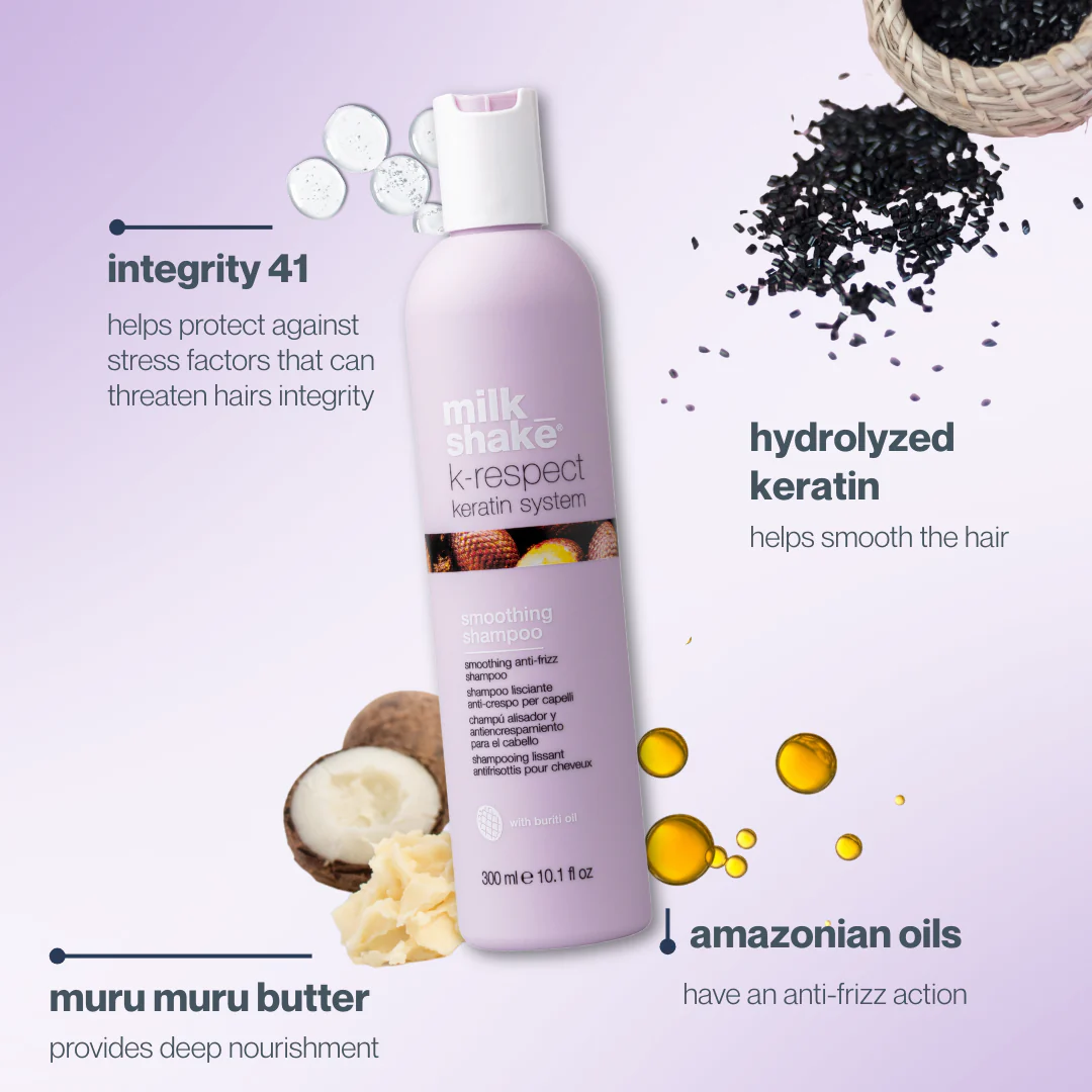 milk_shake® k-respect smoothing shampoo gently cleanses and extends the life of your in-salon smoothing treatment. Enriched with keratin, organic murumuru butter, nourishing milk proteins, and precious Amazonian oils with anti-frizz properties, it maintains smooth, sleek, and frizz-free hair.