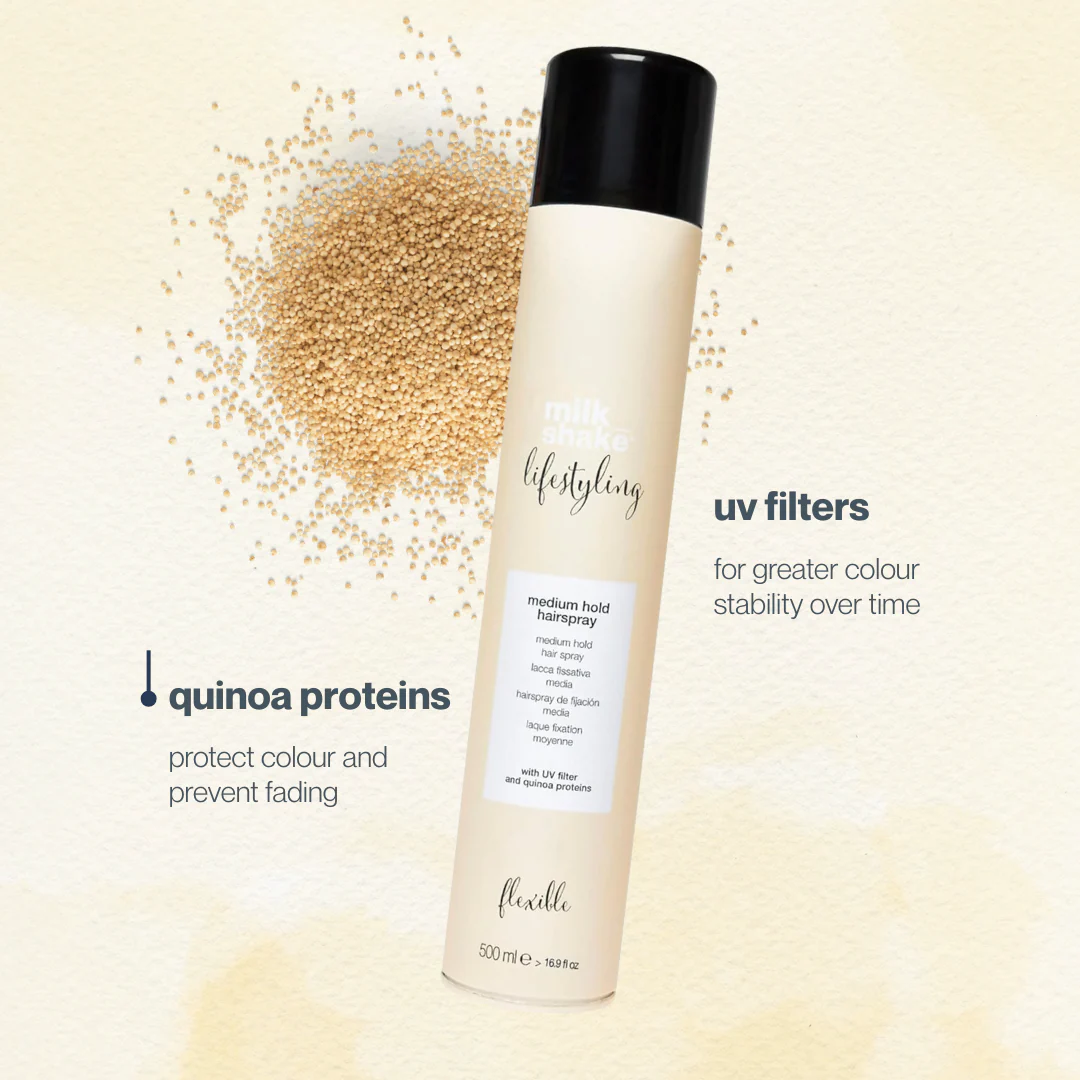 milk_shake lifestyling medium hold hairspray gives flexible hold and a natural result.