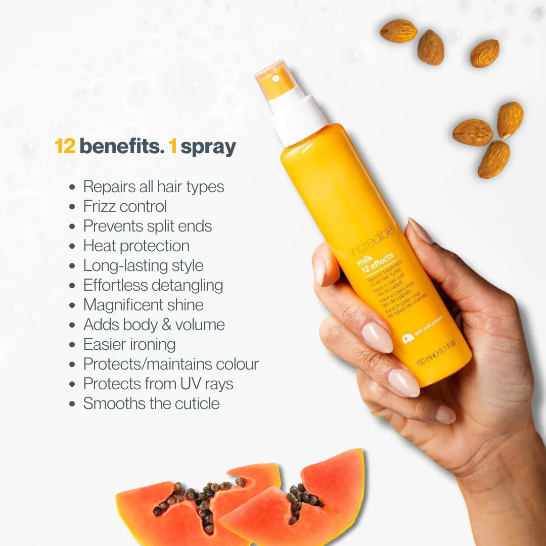 A cult-favourite, best-selling leave-in spray with 12 incredible benefits. This no-rinse formula instantly detangles, nourishes, protects, and enhances manageability in just one spray. Enriched with milk proteins, muru muru butter, and antioxidant-rich fruit extracts (blueberry, raspberry, papaya & mango), it restores softness, shine, and vitality to dull, dry, or damaged hair.
