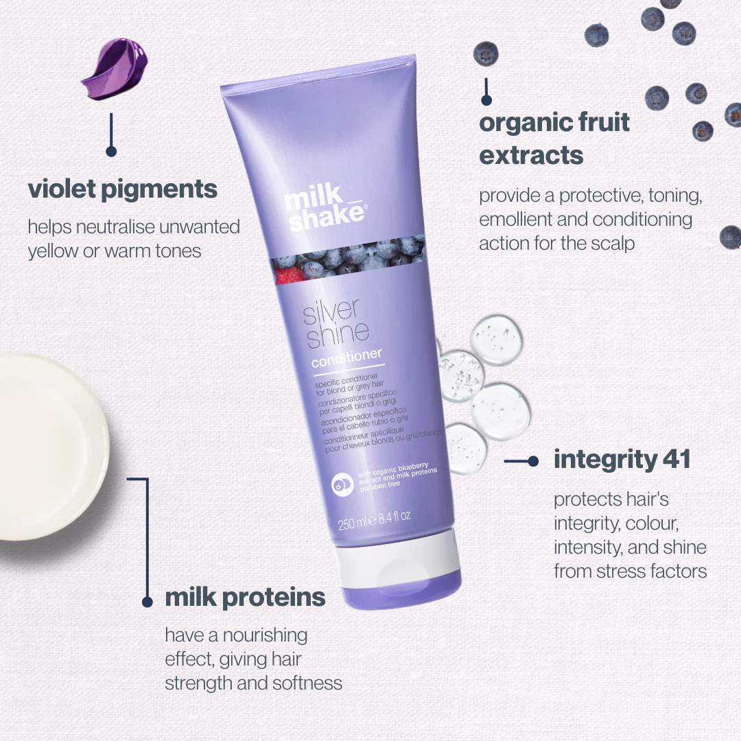 milk_shake Silver Shine Conditioner is formulated with a specific pigment that neutralises unwanted yellow, golden or brassy tones that are common in white, grey, blond or lightened hair. Leaves hair conditioned, soft and full of vitality. Contains milk proteins, organic fruit extracts and Integrity 41® to condition the hair whilst maintaining the hair’s moisture balance and protecting hair colour.